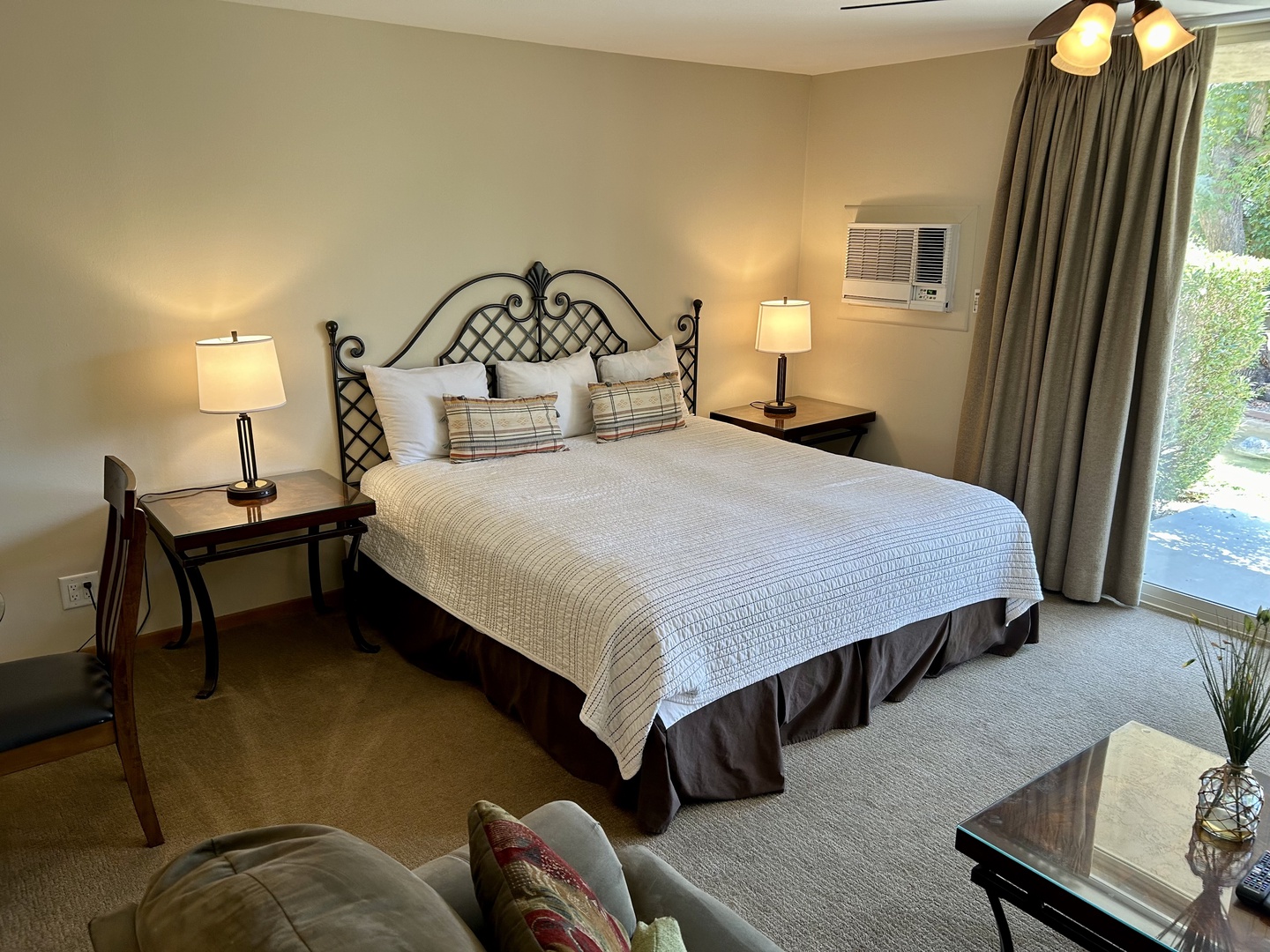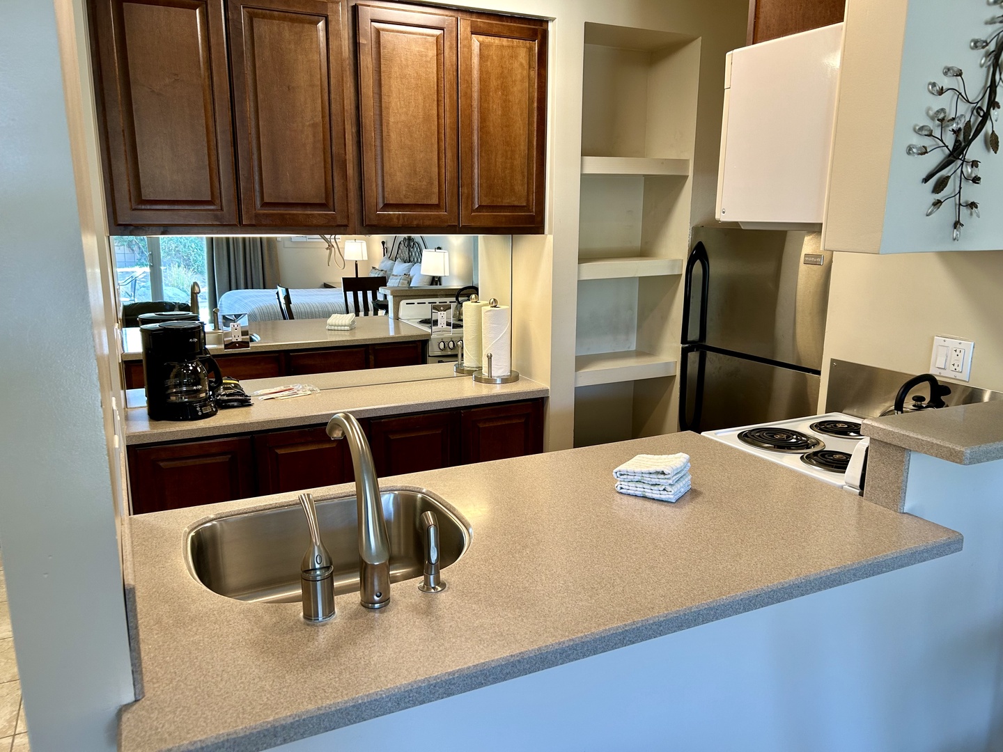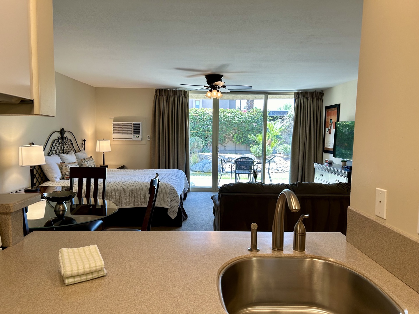 Studio Suite with sofa sitting area, bathroom, and fully appointed kitchenette. Private balcony. Shadow Mountain Resort and Club pool and tennis privileges included with this beautiful studio. Swim in the largest pool in the desert, play tennis or pickleball on 16 courts (3 clay and 2 lighted). Located in a private gated community, walking distance to El Paseo Boulevard, this cozy studio is nicely appointed for your home away from home.