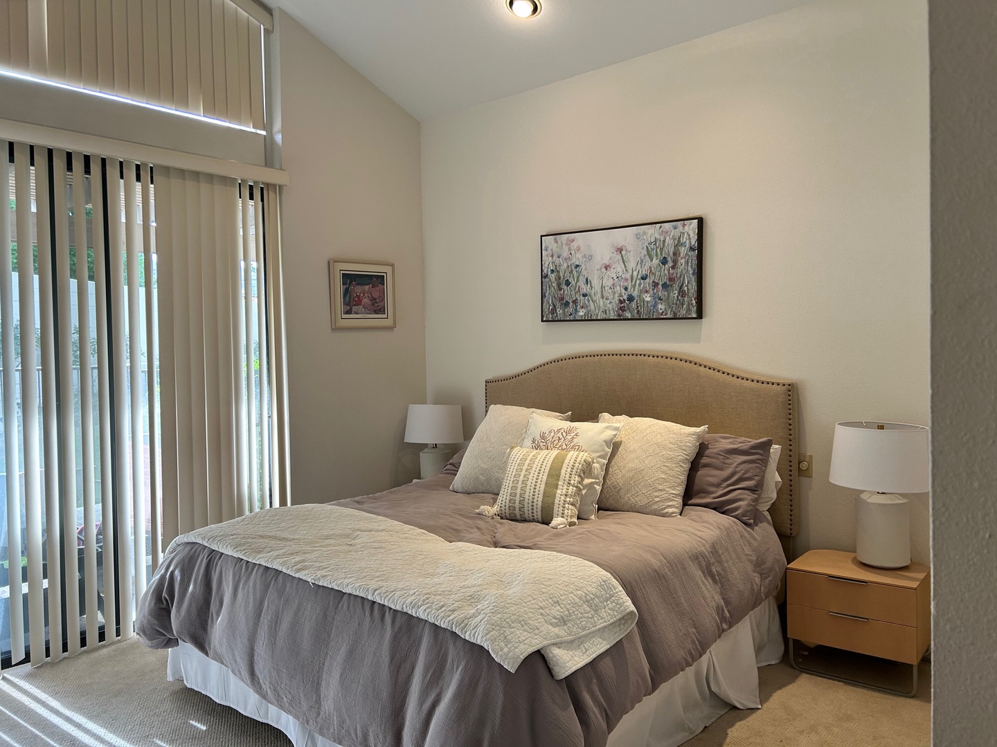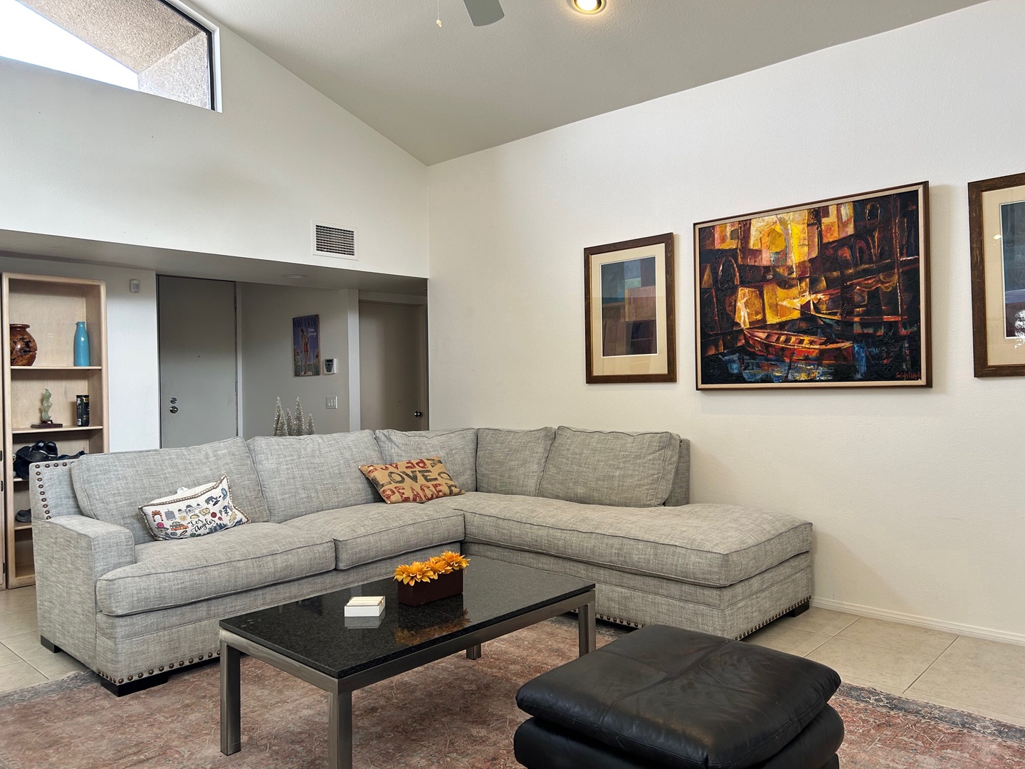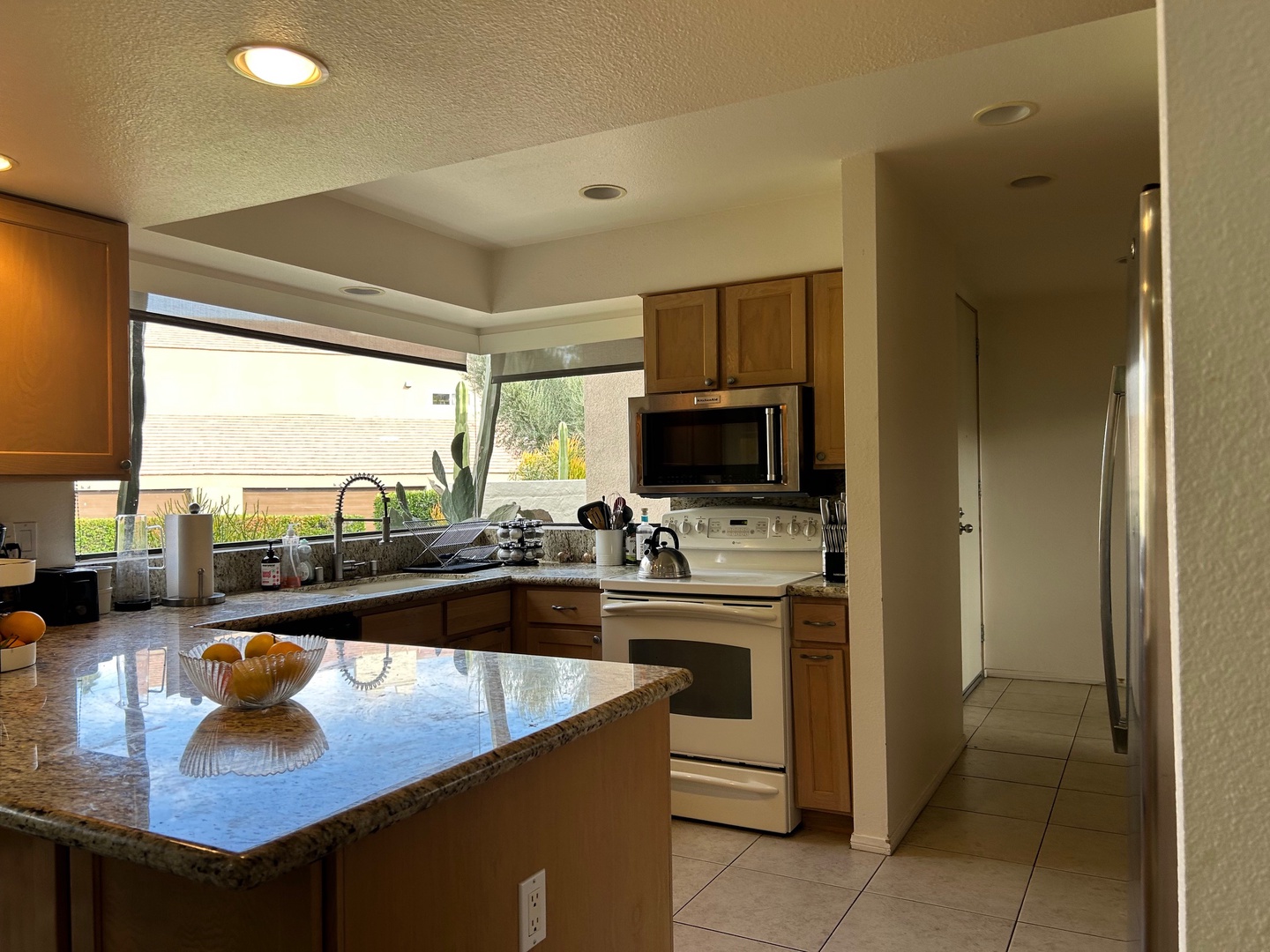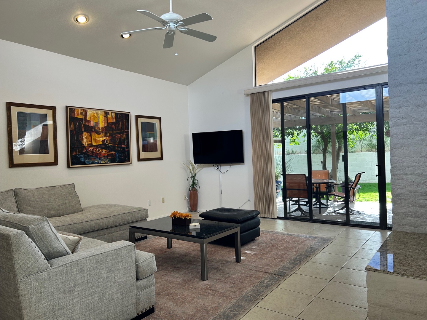 Three bedroom, two bath villa with spacious living and dining room. Fully appointed kitchen. Private patios off each room. Gas fireplace, washer and dryer. Shadow Mountain Resort and Club pool and tennis privileges included with this beautiful villa. Swim in the largest pool in the desert, play tennis or pickleball on 16 courts (3 clay and 2 lighted). Located in a private gated community, walking distance to El Paseo Boulevard, this villa is nicely appointed for your home away from home.